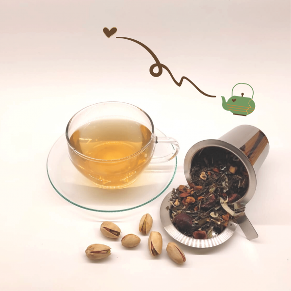 Ingredientes: té verde (54%), trozos de manzanas tostadas, trozos de manzana blanca,chips de coco, semillas de pistacho* (5%), aroma, rodajas de arándanos ácidos liofilizados, pétalos de aciano blanco
